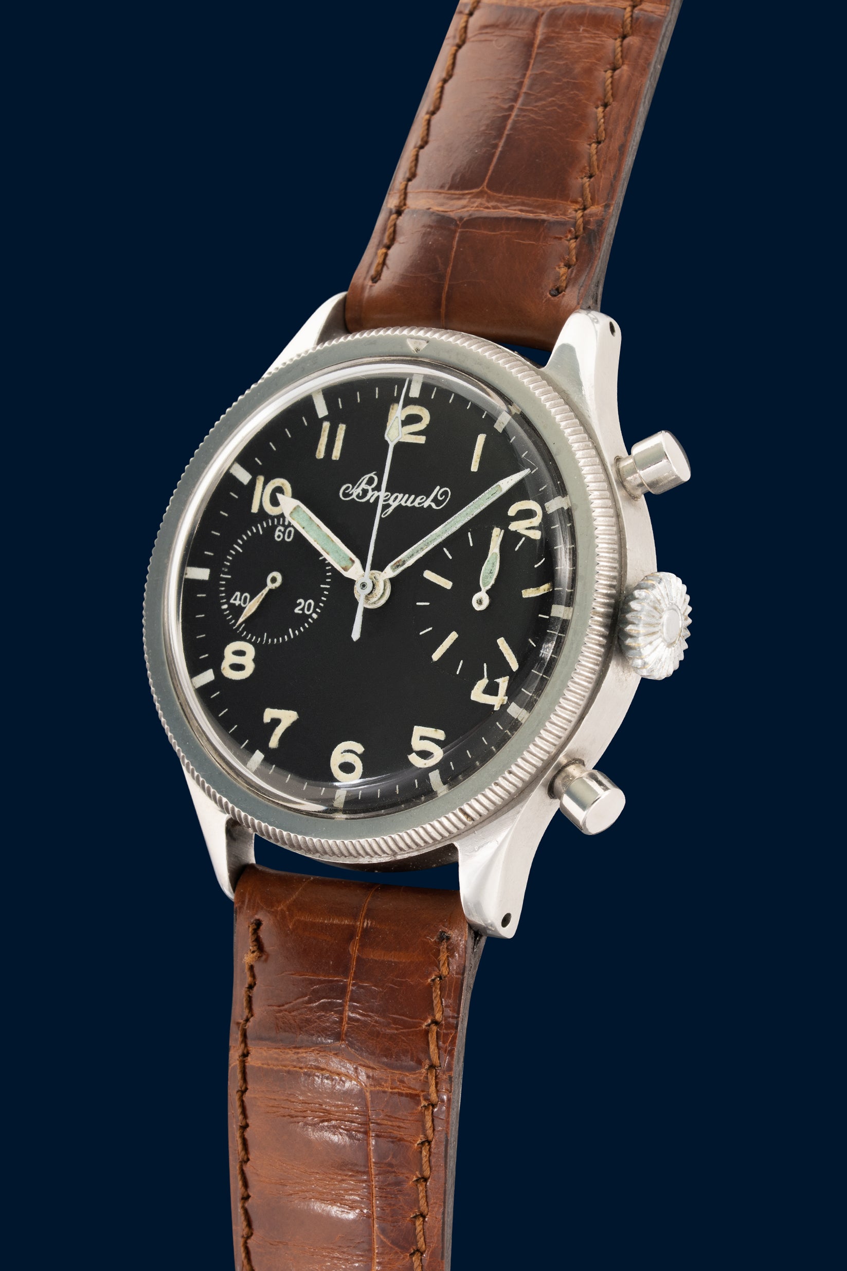 A legendary watch, this Breguet Type 20 is the famous French Naval Aviation (Aéronavale) model. This watch isn't a civilian timepiece, but a military watch used by naval aviators on aircraft carriers. In its French Navy configuration, it features two subdials. All warranty expiration dates are found on the back, and it's one of those iconic watches that belongs in any collection.
