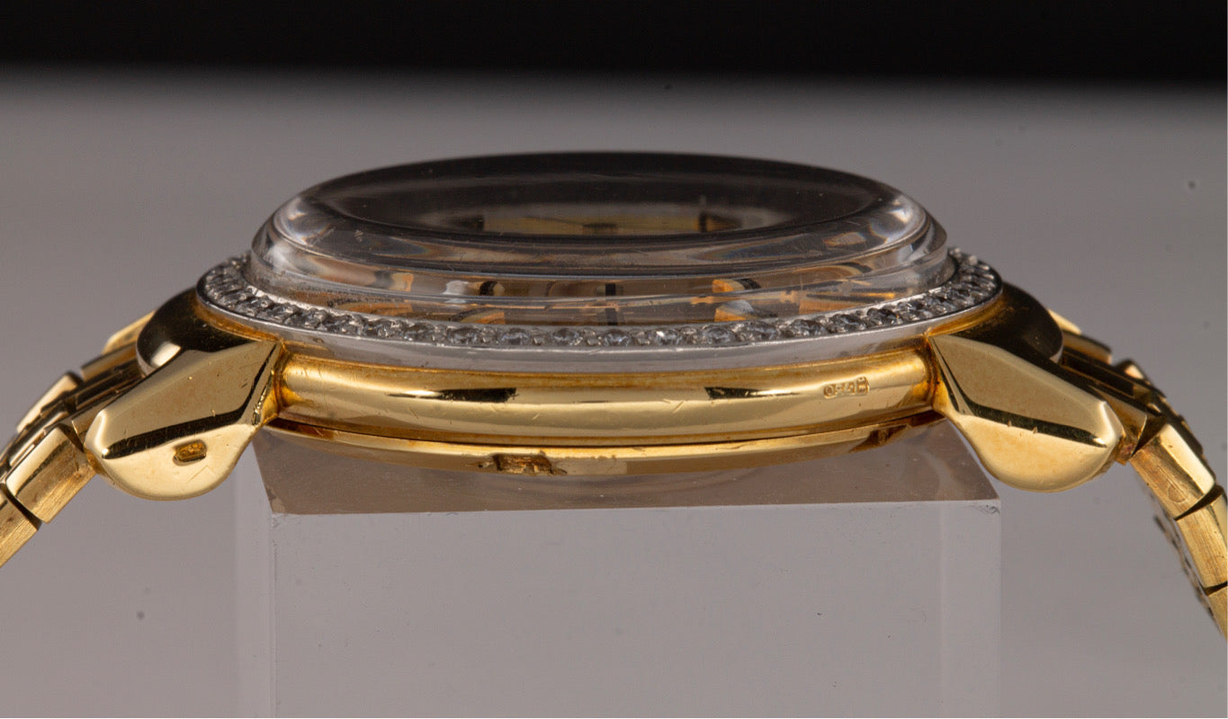 Parmi ses détails les plus remarquables, on retrouve un boîtier aux entrecornes “Hooded Lugs” caractéristiques, une lunette sertie de 48 diamants, ainsi qu’un bracelet en maille tressée en or 18 carats, produit exclusivement sur quelques modèles. Ce bracelet, d’une rare sophistication, n’a jamais été réédité depuis, renforçant son statut d’exception.