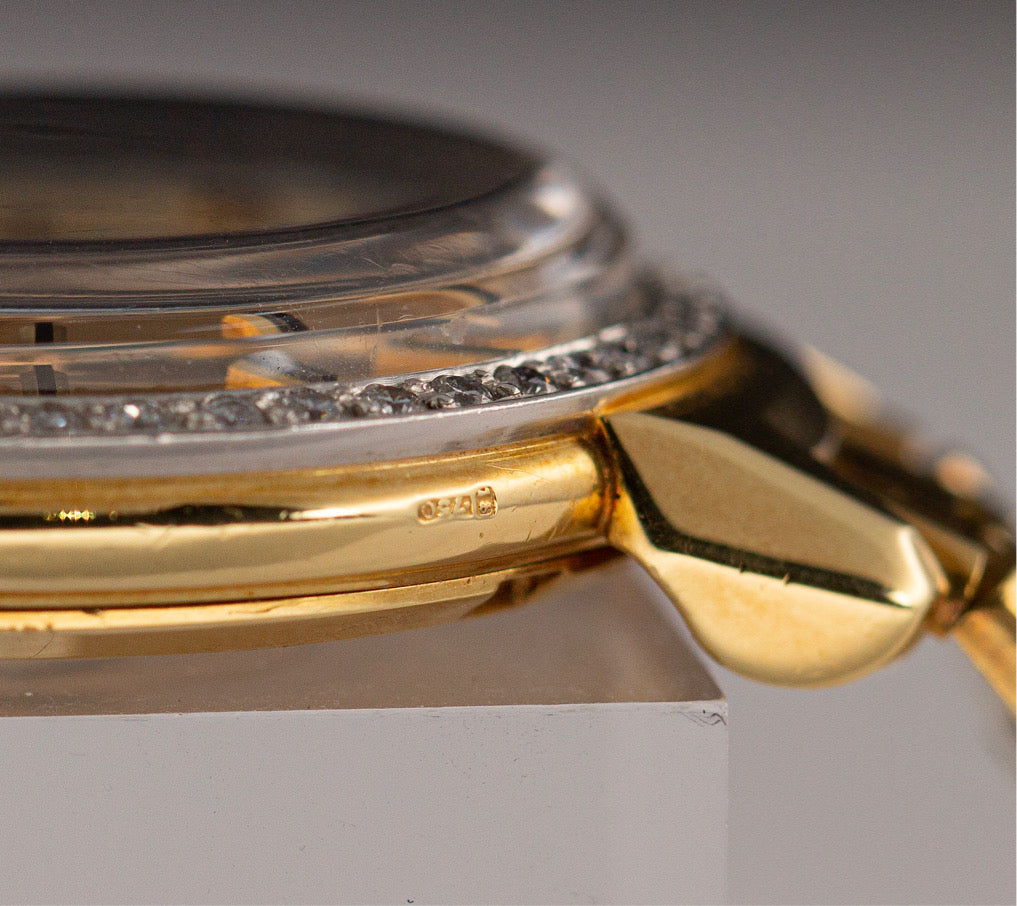 Among its standout details are a case with the distinctive “Hooded Lugs,” a bezel adorned with 48 diamonds, and a woven 18-carat gold mesh bracelet, produced exclusively for a few select models. This bracelet, a true masterpiece of craftsmanship, was never reissued, cementing its rarity.