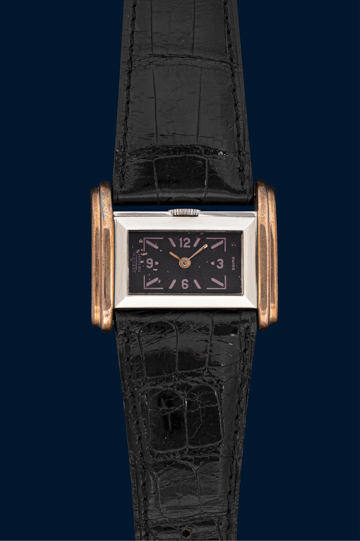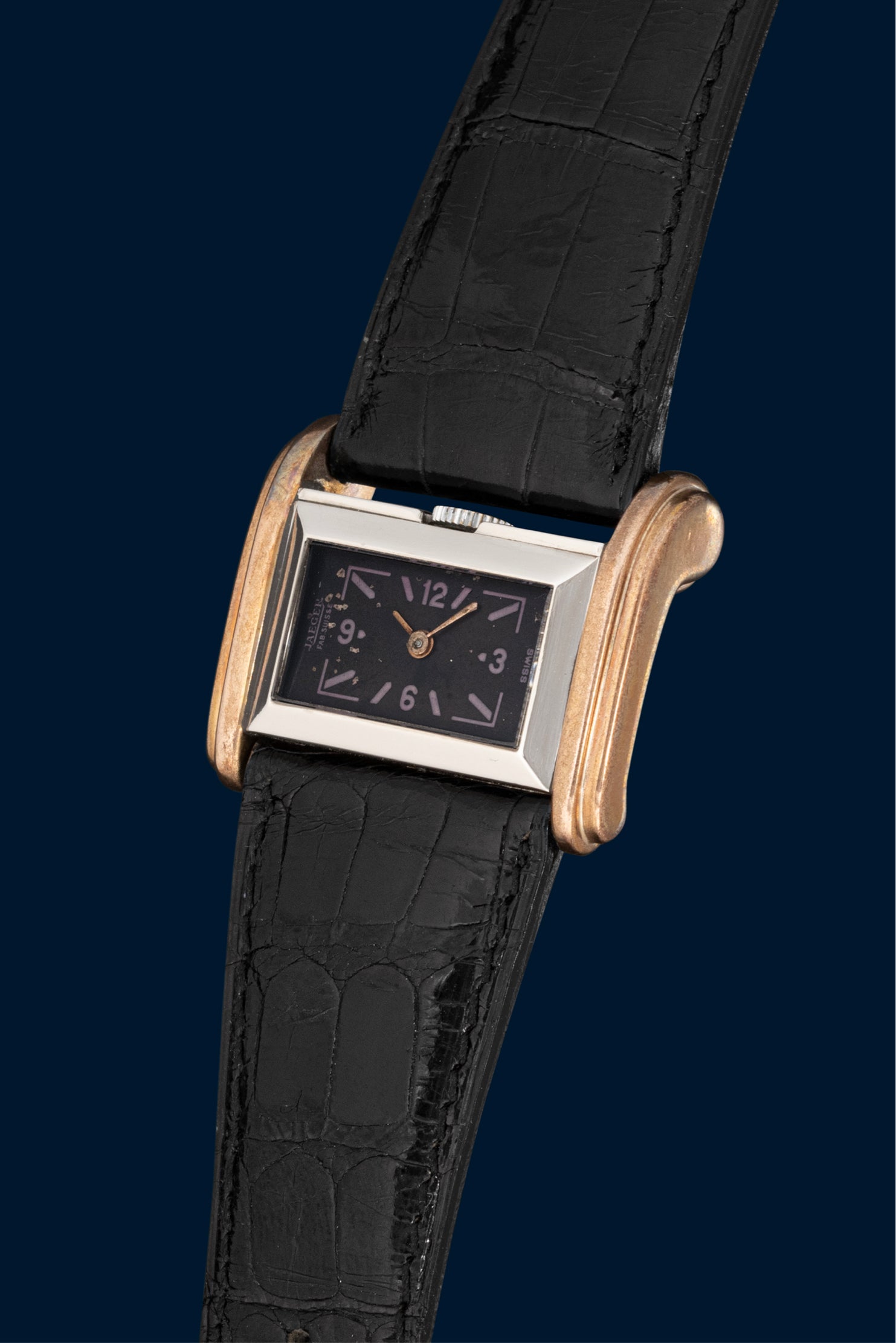 Here is a Jaeger-LeCoultre, a genuine 1940s pilot's watch in rose gold and steel. These are very special watches, designed to be worn on the side of the wrist. The goal was for the driver to be able to read the time without taking their hands off the wheel, keeping their hand firmly in place.