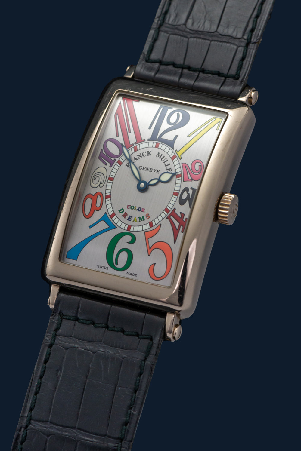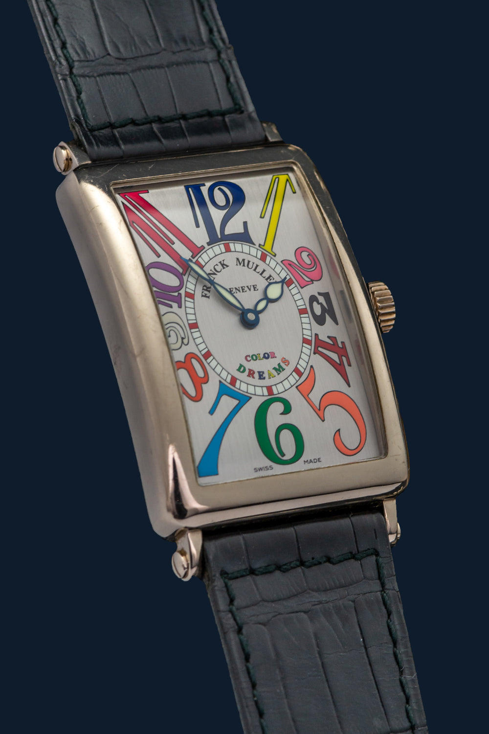 Dans la famille des montres Tank-like, Franck Muller a toujours réussi à proposer des montres ultra-éclectiques, et c'est le cas de cette Colors Dreams, qui renferme un gigantesque une infinité de styles en un cadran.