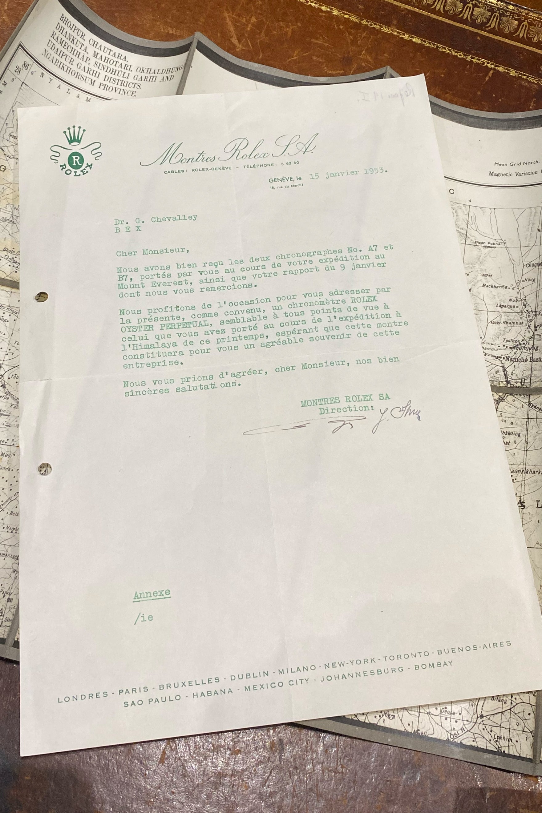 La montre appartenait au médecin de l’expédition, le Dr Gabriel Chevalley. Elle a été portée tout au long de l’ascension et a ensuite été révisée par Rolex après l’expédition, comme l’atteste un document officiel de la manufacture. Fait exceptionnel, cette montre n’est pas restée un simple témoin unique : elle a par la suite gravi l’Everest à plusieurs reprises.