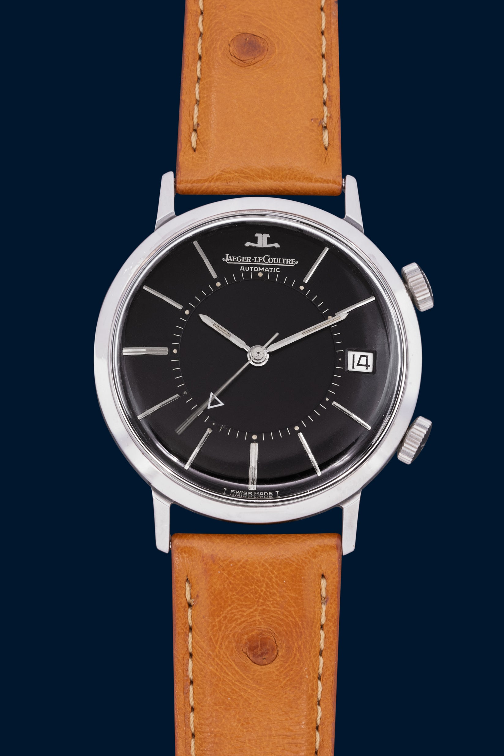 This 1960s automatic Memovox is a particularly interesting and uncommon model, notably because of its black dial—a rare configuration for this reference. The vast majority of Memovox watches from this period featured light-colored dials; this strictly original black dial gives the watch a truly distinctive personality and presence.