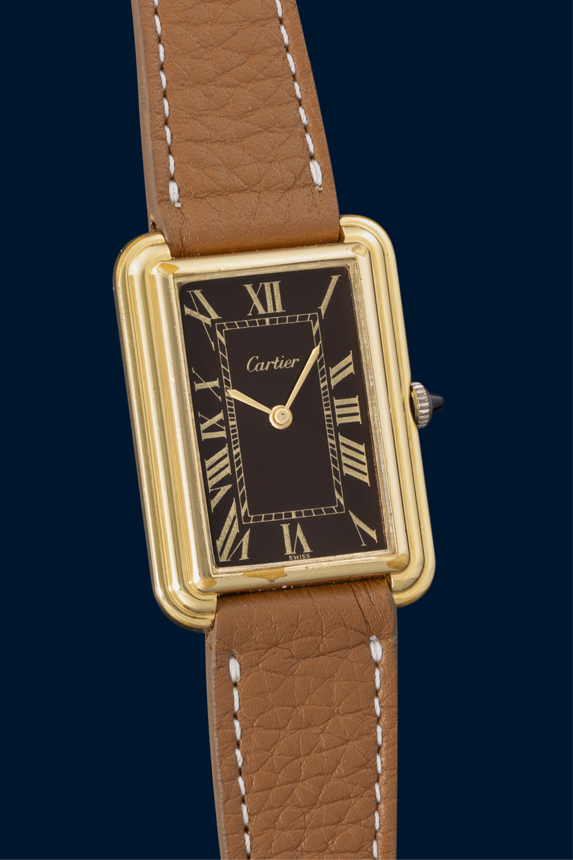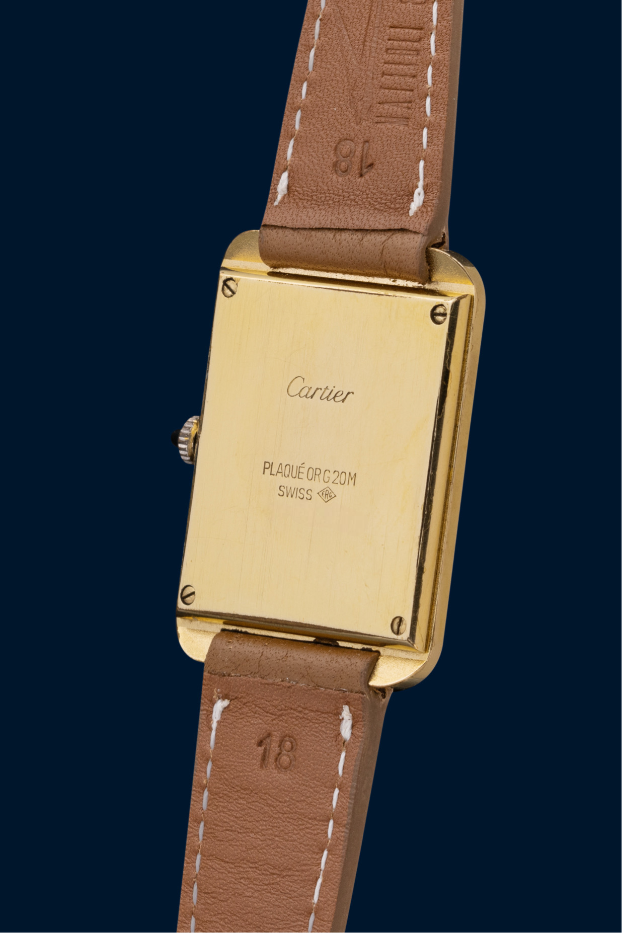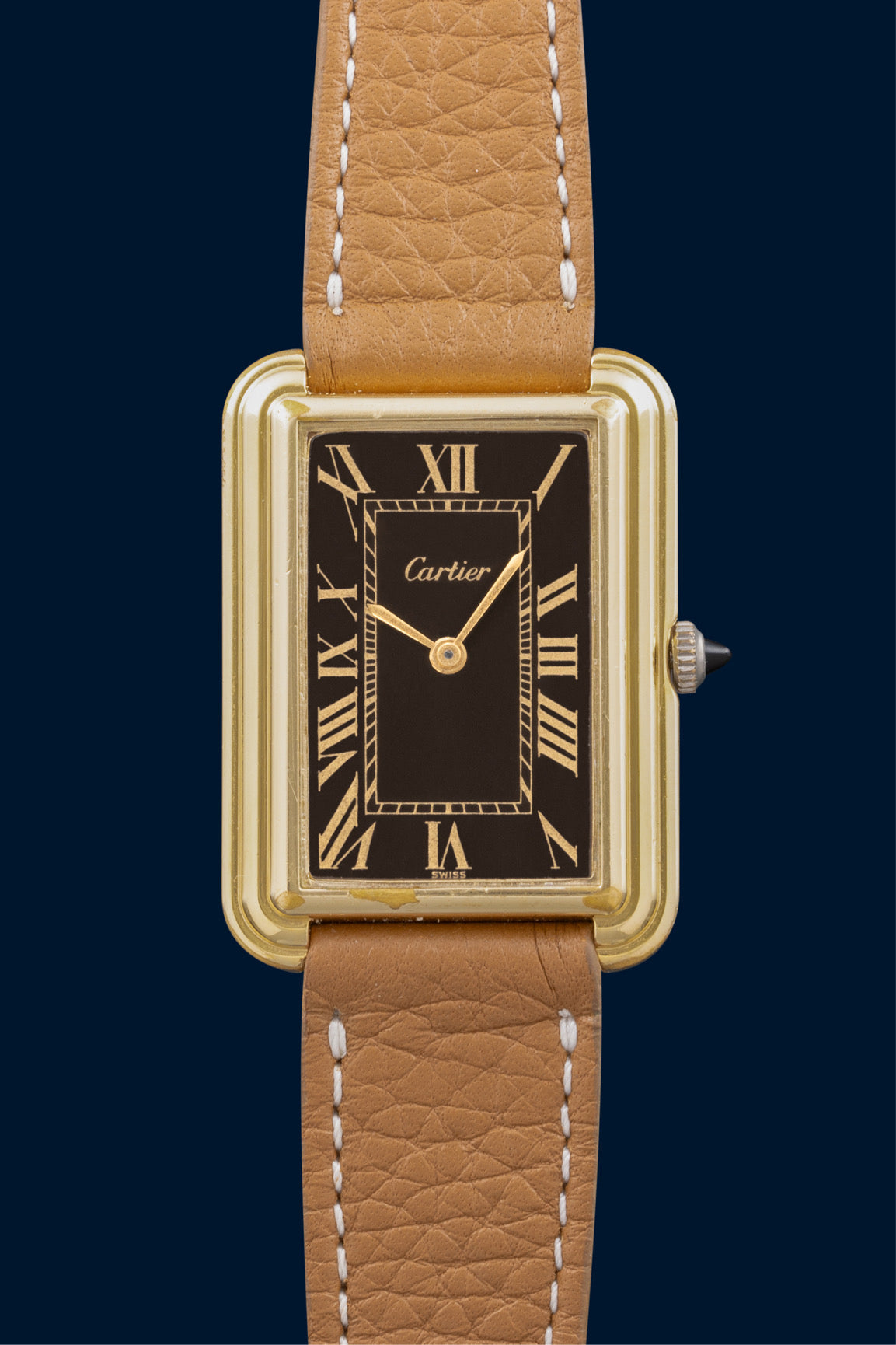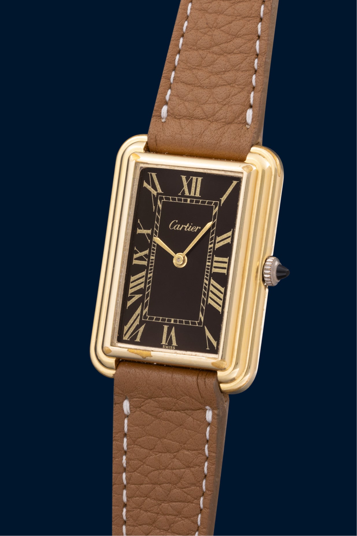 Avec la Tank Stepped Jumbo, Cartier revisite les codes du chic vintage façon années 70. Son boîtier rectangulaire en plaqué or et son cadran chocolat aux chiffres romains dorés donnent à cette montre un charme rétro irrésistible — l’équivalent horloger d’un smoking en velours côtelé parfaitement taillé.
