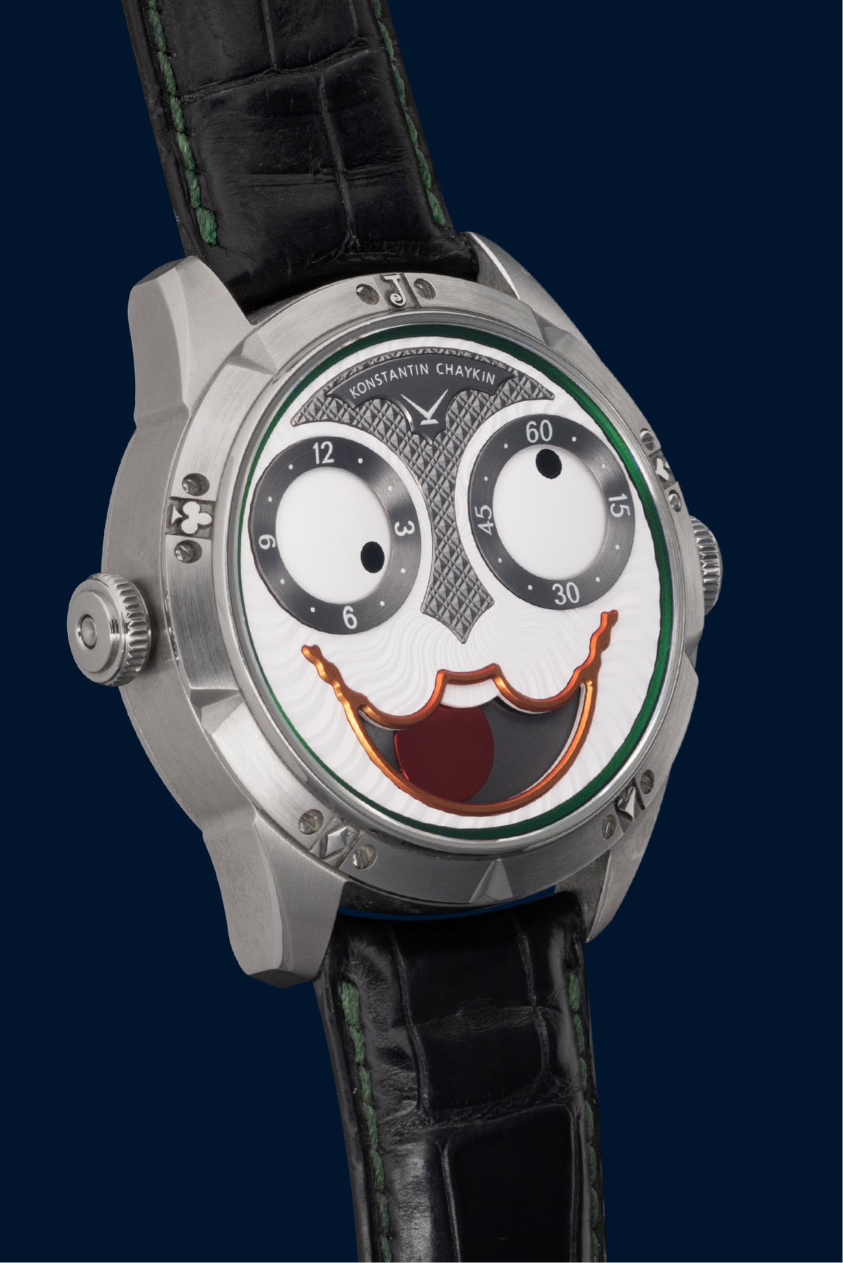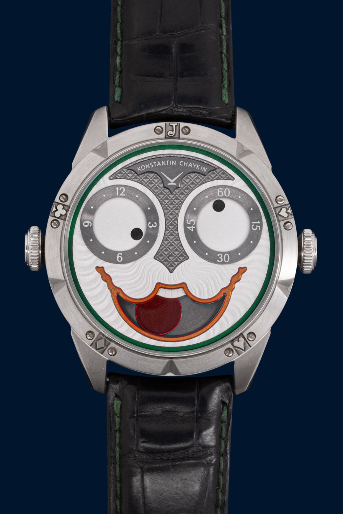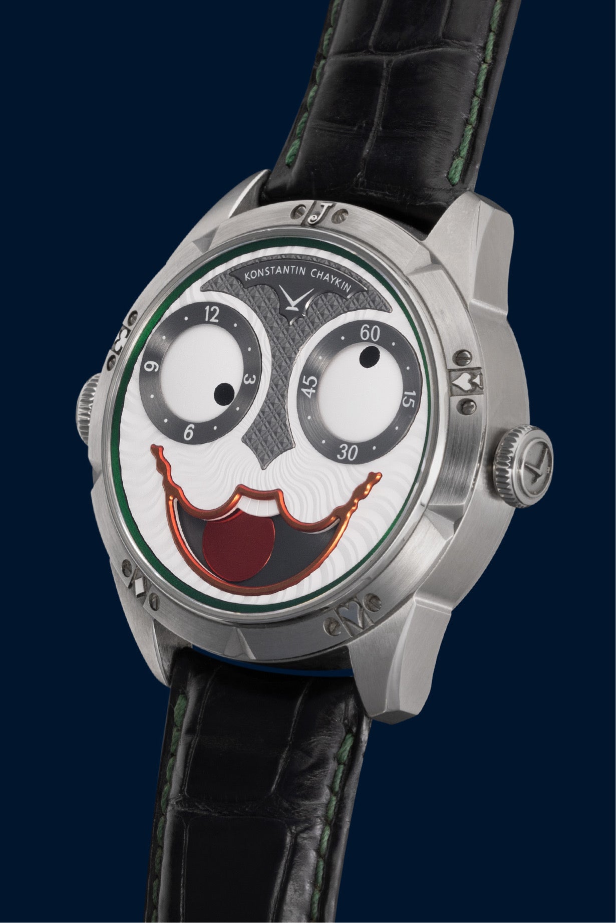 The original Joker watch (2017) introduced the world to Chaykin’s smiling time display, with googly eyes for hours and minutes and a moonphase moon as a tongue. Launched at Baselworld in 2017, the Joker made waves as one of the most extraordinary debuts of the show, instantly captivating collectors with its irreverent charm. At a glance, the Joker’s dial looks like a cartoon face – and that’s entirely by design. The watch tells time through facial features: two subdials form the eyes, with shifting pupils indicating the hours (left eye) and minutes (right eye). When the moonphase is full, the Joker has a full-toothed grin; when it’s a new moon, the mouth is dark, giving the face a different mood. As time passes and the “eyes” roll around, the Joker’s expression constantly changes – it might look cross-eyed at 6:30, surprised at 12:45, or gleeful at 9:15. This watch was produced in a limited run of 99 pieces, and remarkably, all 99 sold out within days of its premiere. It was clear that Chaykin had struck a chord: here was a high-end mechanical watch that didn’t take itself too seriously, offering luxury with a big dose of levity.